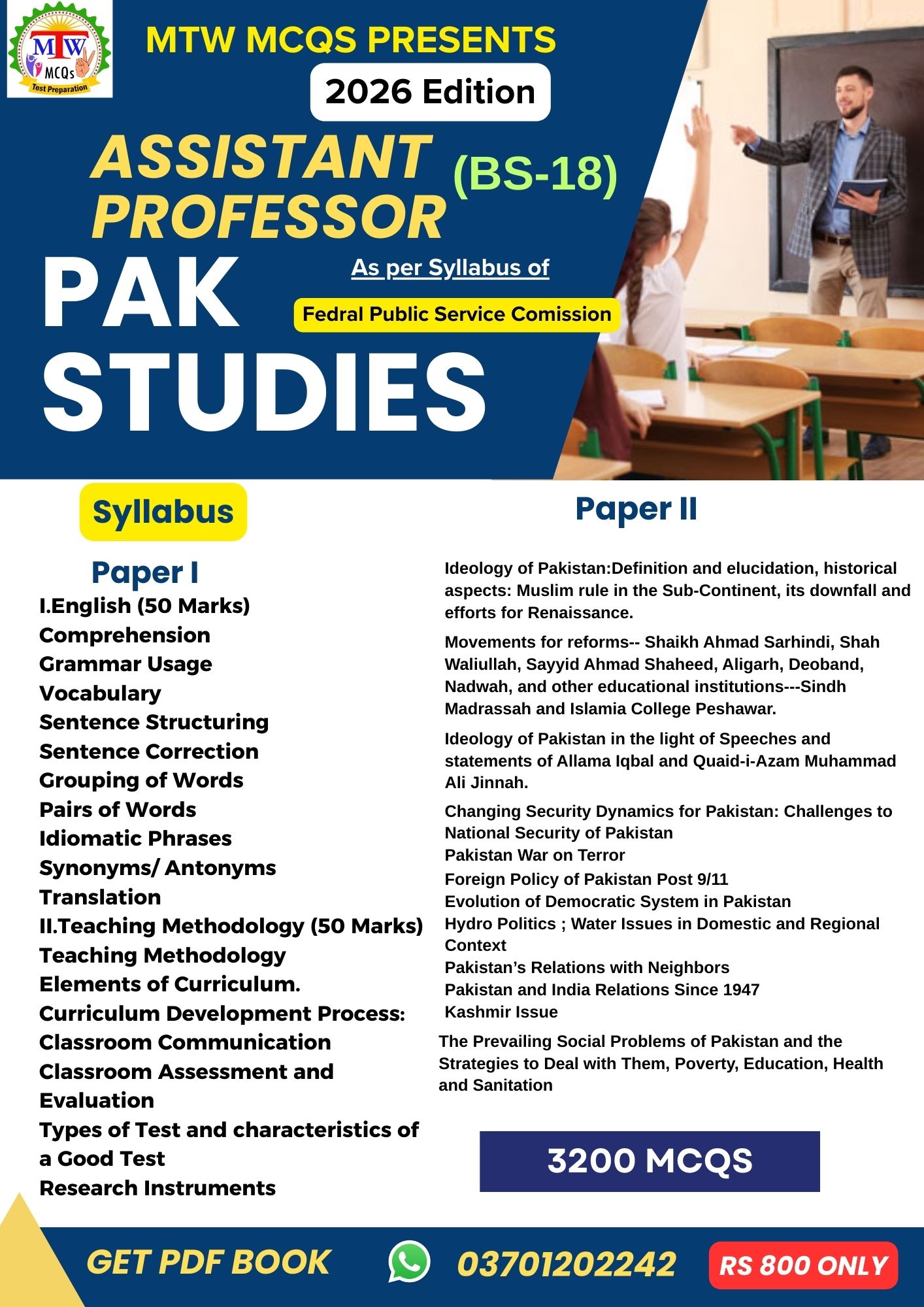 #FPSC #AssistantProfessor #PakistanStudies #MCQs #BS18Jobs #TestPreparation #PDFBooks #TeachingJobs #PakistanJobs